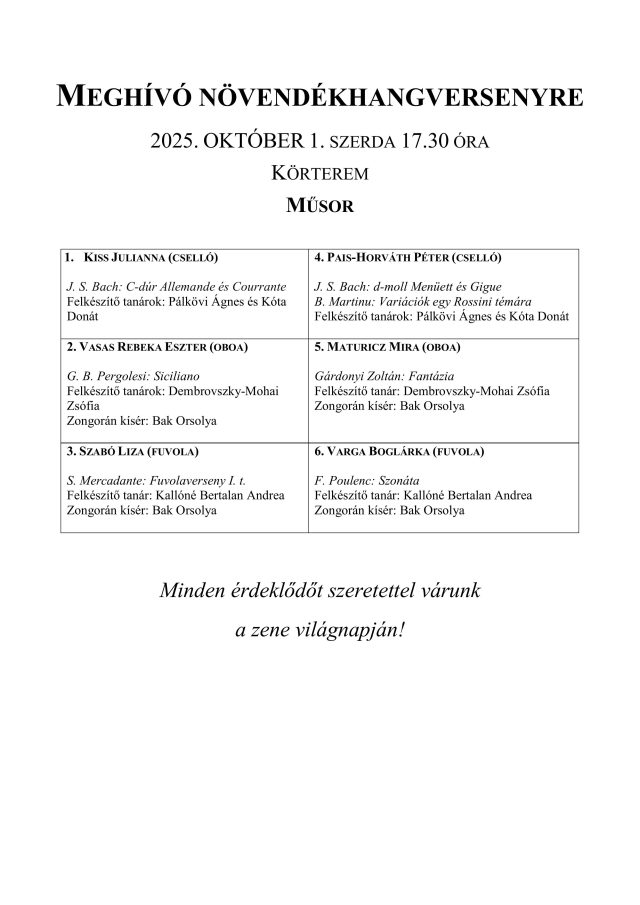 AktuálisKoncertekA zene világnapján2025.10.01.by adminA zene világnapján, október 1-jén (szerdán) 17.30-ra várjuk növendékkoncertre a kedves érdeklődőket.