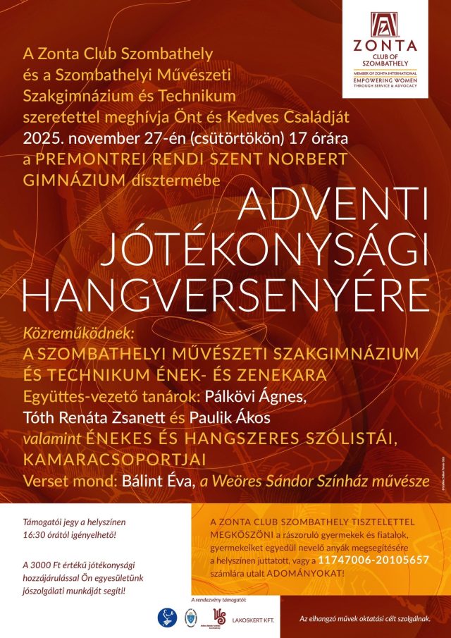 November 27-én lesz az idei adventi jótékonysági koncert iskolánk és a Zonta Club szervezésében.
